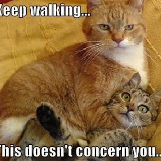 How many of us have come across our own kitties in very similar moments and think this caption sums it all up perfectly...........I know it does for my house. Needless to say, the next time I catch the furry kids here locked together like this, I hope I can stop laughing long enough to break it up!!